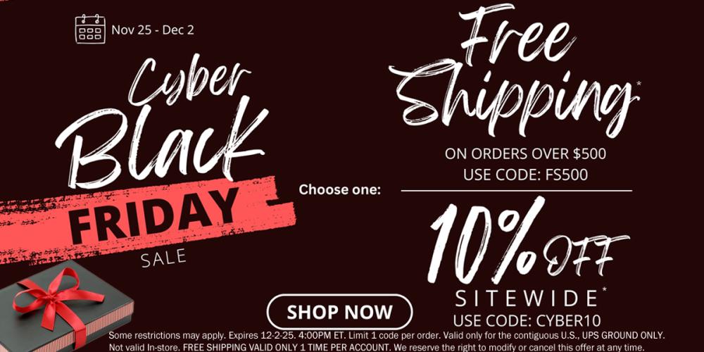 FREE SHIPPING! on orders $500+. USE CODE: FS500 // 10% OFF Sitewide*. USE CODE: CYBER10 // 5% off on all* orders USE CODE: JD25